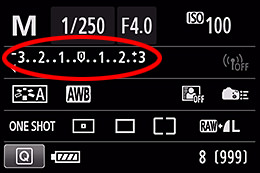 Periksa indikator tingkat pencahayaan pada layar LCD belakang. Berdasarkan posisi tanda tingkat pencahayaan, Anda dapat mengecek perbedaan pada tingkat overexposure (kelebihan cahaya) atau underexposure (kekurangan cahaya) dibandingkan dengan tingkat pencahayaan standar.