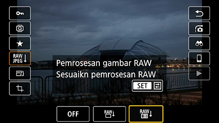 1. Dalam mode playback, tekan tombol SET dan navigasikan ke ikon pemrosesan gambar RAW. Pilih ikon paling kanan untuk menyesuaikan pemrosesan RAW.