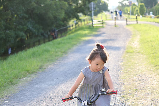 Permukaan tanah yang berbatu menyulitkan untuk mengayuh sepeda, dan sang anak tampak cemas, jadi saya harus membujuknya agar terus mengayuh sementara saya mengambil bidikan. Karena saya ingin menangkap jalur yang lurus, saya naik undakan yang ada di lokasi dan membidik sedikit dari atas dengan komposisi yang memperluas latar belakang.