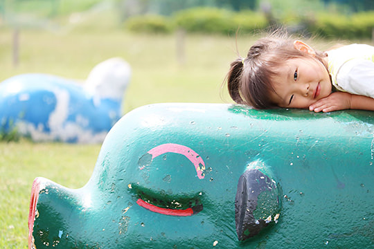 Meringkuk dengan nyaman di atas mainan dalam kehangatan sinar surya. Pergerakan dan ekspresi sang anak saat berbaring sejenak, kemudian langsung berlarian, tampak sangat menggemaskan, bukan? Pemotretan dengan komposisi yang tampak meluas ke dalam jarak, bokeh lembut yang hanya bisa ditangkap dengan lensa telefoto dapat juga diciptakan.