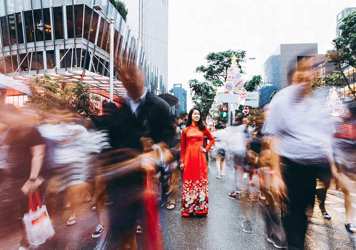 Motion blur adalah teknik menyenangkan yang dapat Anda gunakan untuk mengambil foto jalanan ini. Anda dapat menangkap pemandangan seperti kerumunan di sebelah kereta yang bergerak, foto panning dari subjek yang bersepeda melintasi dinding berwarna-warni di kota, atau fokus pada satu orang yang berdiri di tengah kerumunan orang yang bergerak (gambar di bawah). Semua ini akan menghasilkan foto yang memukau dan penuh makna.