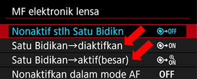 Untuk mengaktifkan fokus manual penuh, Anda harus mengubah pengaturan kamera dan mengaktifkan salah satu dari dua opsi yang diindikasikan oleh panah. Bacalah buku petunjuk kamera untuk keterangan selengkapnya. Pada kebanyakan lensa, fokus manual penuh hanya didukung dalam mode One-Shot AF. Namun demikian, sebagian lensa seperti RF400mm f/2.8L IS USM dan RF600mm f/4L IS USM juga mendukungnya dalam mode Servo AF.