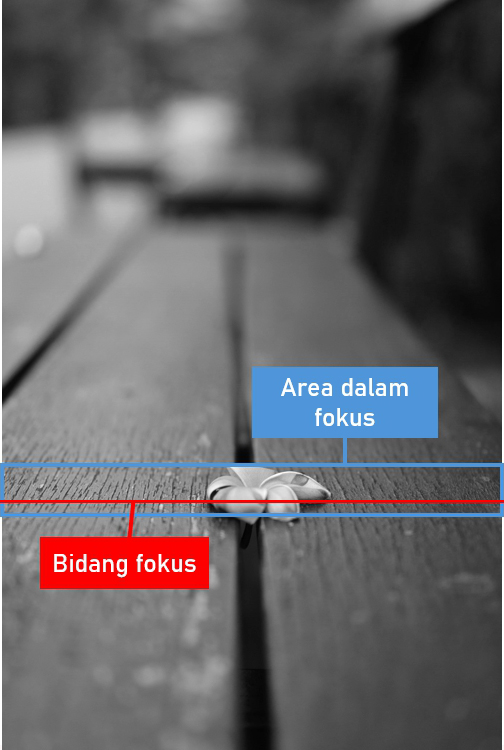 Kami menempatkan titik fokus pada bunga. Saat kamera memfokus pada bidang datar, sebagian bangku di sebelah kiri dan kanan bunga, juga ikut terfokus.