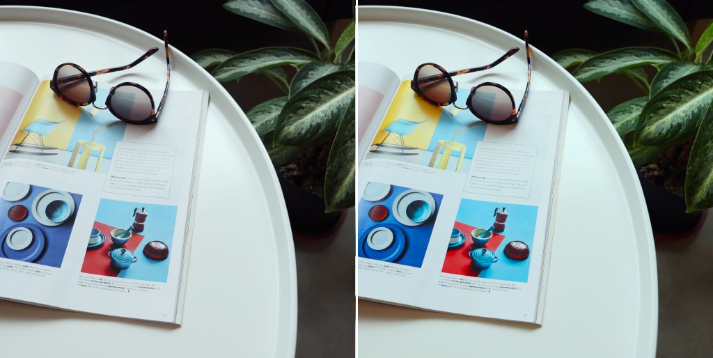 Namun, ketika Anda menggunakan mode Creative Assist untuk meningkatkan setelan saturasi, Anda bisa melihat perbedaan yang sangat jelas bagaimana warna tersebut muncul. Pada contoh di bawah, foto sebelah kiri memiliki saturasi normal, sedangan yang kanan memiliki saturasi yang telah ditingkatkan.