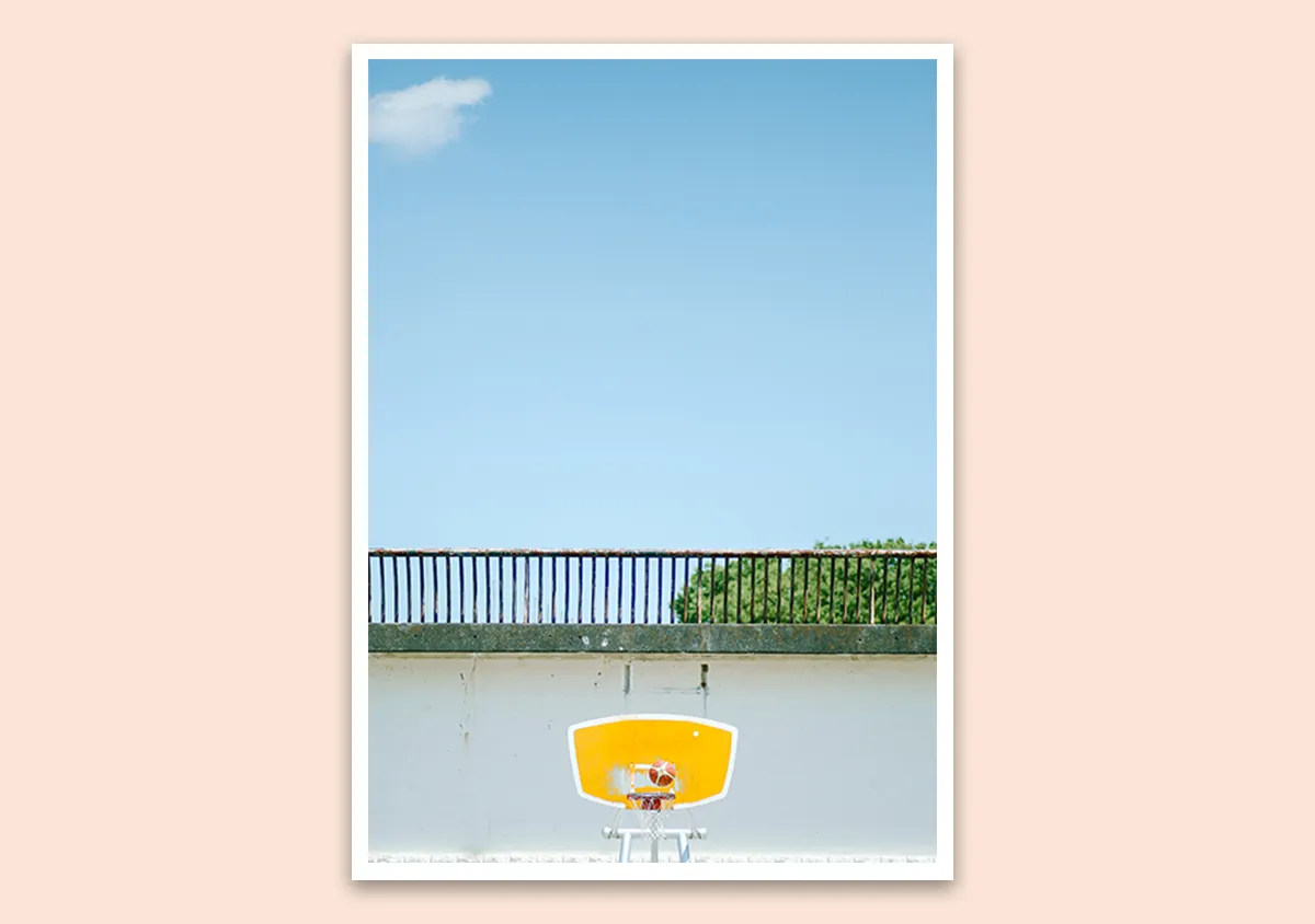 Dalam bidikan utama, saya menyertakan gawang bola basket dan bola basketnya, yang bernuansa oranye—warna yang melengkapi langit biru. Kedua objek ini juga menambah ritme pada gambarnya.