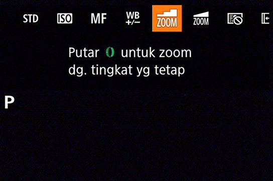 Layar waktu pemotretan apabila menentukan fungsi zoom bertahap ke cincin kontrol. Panjang fokus ekuivalen ditampilkan di bagian bawah layar.