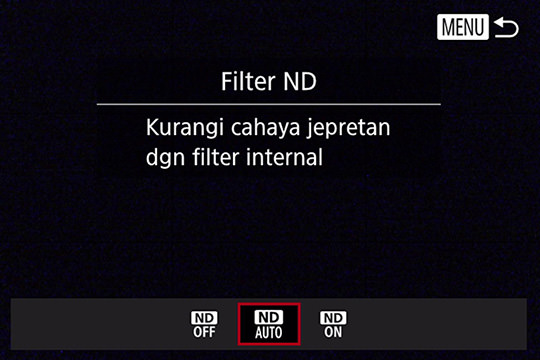 Filter ND efektif sudah disatukan ke dalam kamera. Jadi, apabila Anda ingin membidik dengan aperture yang sepenuhnya terbuka atau untuk pemotretan pencahayaan lama. Untuk penggunaan normal, Anda seyogianya dapat menetapkan fungsi ini ke mode Auto tanpa masalah apa pun.