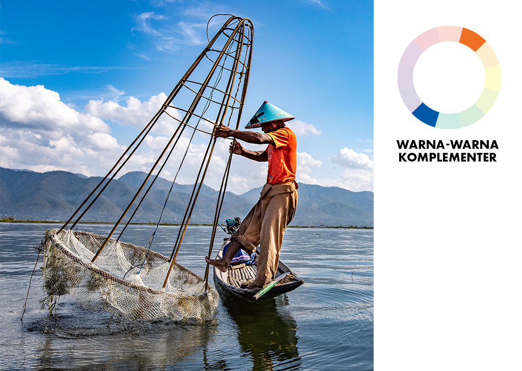 Salah satu harmoni warna yang paling banyak digunakan adalah kombinasi warna komplementer. Dalam spektrum warna, warna-warna komplementer ditentukan dari warna yang saling berlawanan satu sama lain. Sebagai contoh, hijau dan merah, ungu dan kuning, dan seperti yang digambarkan di atas, warna biru (langit dan laut) dan oranye (subyek manusia). Kombinasi warna ini memunculkan kontras dari nada warna yang hangat dan sejuk serta sering digunakan untuk memperlihatkan titik fokal atau untuk menambahkan daya tarik/tegangan terhadap foto. Karena hanya memerlukan dua warna saja, kombinasi ini sangat mudah dipakai untuk menghasilkan ambilan foto yang dinamis.