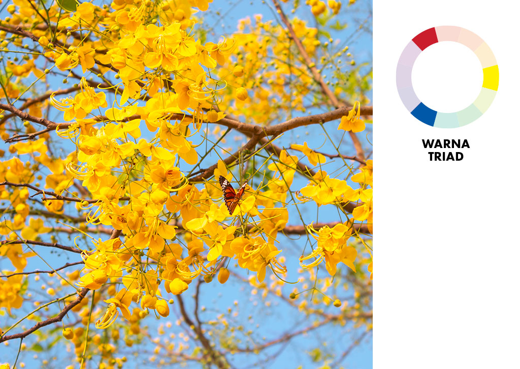 Kombinasi warna triad menggunakan setiap warna keempat pada roda warna. Sebagai sebuah pengukur, kombinasi ini harus menciptakan sebuah segitiga sama sisi ketika warnanya diberi tanda dengan sebuah garis penghubung. Hal ini akan menghasilkan sebuah ketidakseimbangan rasio warna 2:1, dan seperti yang ditunjukkan oleh contoh di atas, ada 2 warna hangat kuning-oranye (bunga) dan merah-ungu (cabang pohon) melawan satu warna sejuk (latar belakang langit). Seperti Aturan Sepertiga, kombinasi warna triad membawakan daya tarik visual dan adanya persepsi susunan melalui kualitas dari ketidakseimbangan yang mengejutkan. Untuk menggunakan kombinasi warna triad berarti menyoroti satu warna dominan sementara dua warna lainnya berperan sebagai warna pelengkap.
