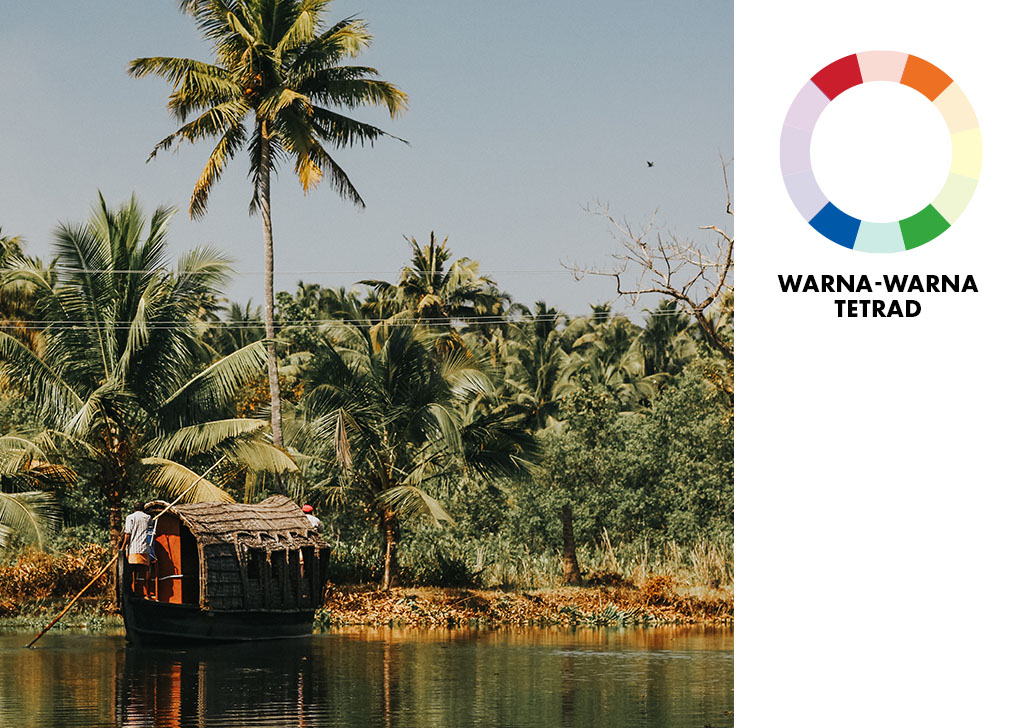 Kombinasi warna tetrad menggunakan empat warna dan meliputi dua kombinasi komplementer yang membentuk sebuah persegi panjang ketika ditarik dengan sebuah garis penghubung. Akhir persegi panjang yang lebih pendek selalu merupakan satu warna yang berjarak terpisah. Walaupun warna komplementer semua meliputi adanya tegangan (dan kami akan berharap memiliki lebih banyak lagi ketika menggunakan dua set warna), kombinasi warna tetrad masih bekerja. Kontras yang kuat ini sering dipencarkan melalui variasi warna yang ada di lokasi sehingga menghasilkan sebuah aliran yang selaras dan tidak saling bersaing tanpa terdapat satu warna spesifik yang bersaing untuk mendominasi. Bahkan dalam distribusi warna yang berbeda-beda seperti foto di atas, warna sejuk biru yang dominan (langit) dan hijau (tanaman) dengan warna hangat kuning yang lembut (tanah) dan oranye (pintu perahu) hasilnya masih akan tetap terlihat cukup seimbang dan indah dipandang.