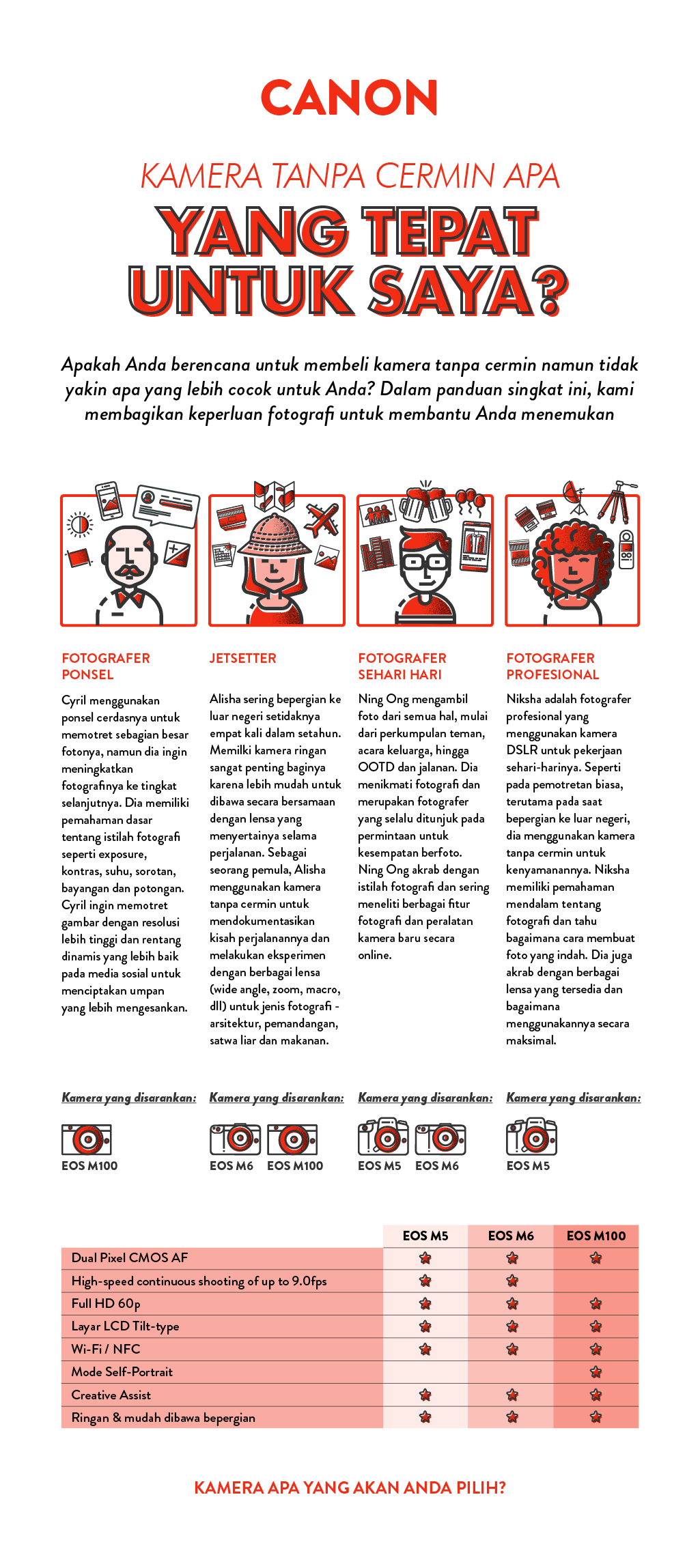 Tipe fotografer apakah diri Anda? Pilihlah sebuah karakter dan temukan kamera tanpa cermin yang tepat untuk Anda.