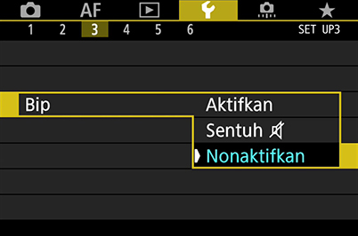 Saran: Sebagian fotografer mungkin merasa bahwa bunyi bip saat subjek berada dalam fokus, membantu untuk menetapkan kecepatan bidikan. Jika Anda termasuk fotografer seperti ini, dan pemandangannya tidak memerlukan kesenyapan yang ekstrem, cobalah opsi menengah, yang menonaktifkan bunyi bip hanya untuk pengoperasian sentuh.