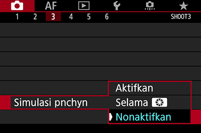 Catatan: Anda bisa membiarkan exposure simulation aktif jika menggunakan lampu kilat Canon.