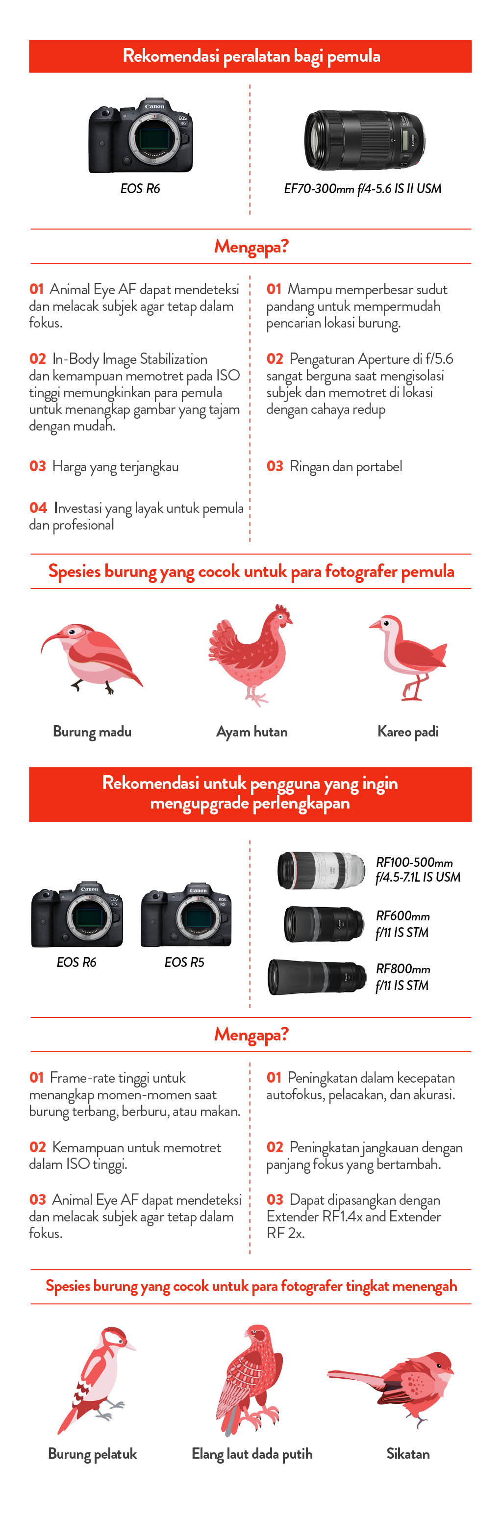 Para pemula disarankan untuk menggunakan lensa zoom telefoto seperti lensa Canon EF70-300mm f/4-5.6 IS II USM (dengan adaptor lensa EF untuk Canon EOS R6) atau panjang fokus serupa. Dengan sudut panjang yang sempit mulai dari 300mm dan seterusnya, pemula biasanya akan kesulitan menemukan subjek (burung) saat mereka mendekatkan kamera ke mata. Kemampuan lensa zoom telefoto untuk memperbesar perspektif akan membuat pencarian burung jauh lebih mudah. Pengaturan aperture lebar di f/5.6 akan sangat berguna saat memotret di lokasi dengan pencahayaan yang redup. Fotografer dapat mengisolasi subjek dengan cepat melalui teknik latar belakang buram. Keunggulan utama dari kamera EOS R6 terletak di bentuk bodinya yang kecil, ringan, dan portabel, sangat cocok untuk dibawa berpetualang.