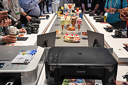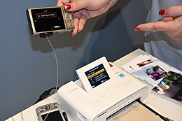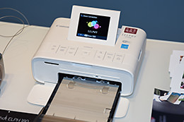 SELPHY CP1200 menampilkan desain baru yang mantap, berkemampuan Wi-Fi, dan dapat dihubungkan, tidak hanya dengan model kamera yang kompatibel, tetapi juga dengan smartphone untuk pencetakan tanpa kabel. Alat ini bagus untuk mencetak proyek dengan segala macam ukuran kertas, termasuk format 4×8 yang khususnya populer di Jepang untuk mencetak kartu pos Tahun Baru. Pada konvensi ini, kami juga memperagakan kemampuannya untuk mencetak stiker.