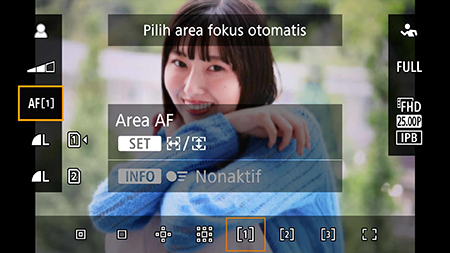 Atur area AF cukup luas untuk mencakup kisaran gerakan sang model. Untuk potret wajah close-up, mungkin area AF persegi adalah yang paling mudah bagi Anda. Anda juga dapat menyesuaikan ukuran area AF di menu Pengaturan Cepat (Quick Setting) selama memotret.