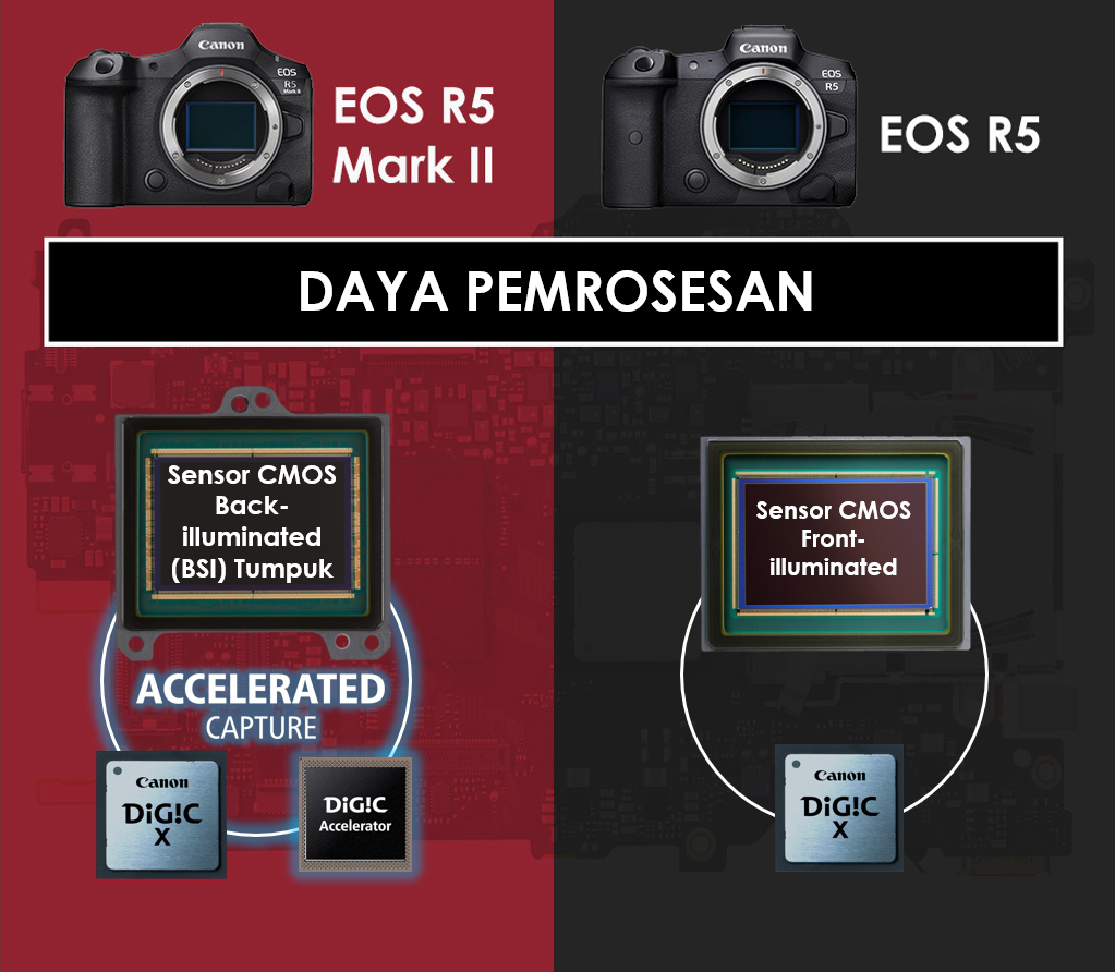 Sementara itu, pada EOS R5 Mark II, DIGIC X didukung oleh DIGIC Accelerator co-processor, yang membantunya menganalisis dan memproses informasi yang masuk secara beruntun dalam jumlah besar dari sensor tumpuk penyinaran belakang. Sensor baru, DIGIC X, dan DIGIC Accelerator, secara bersama membentuk sistem Accelerated Capture baru, yang memberikan kecepatan pemrosesan dan daya untuk menjalankan berbagai fitur kamera yang intensif sumber dayanya, bahkan dengan AF yang diperluas dan fungsi berbasis deep learning.