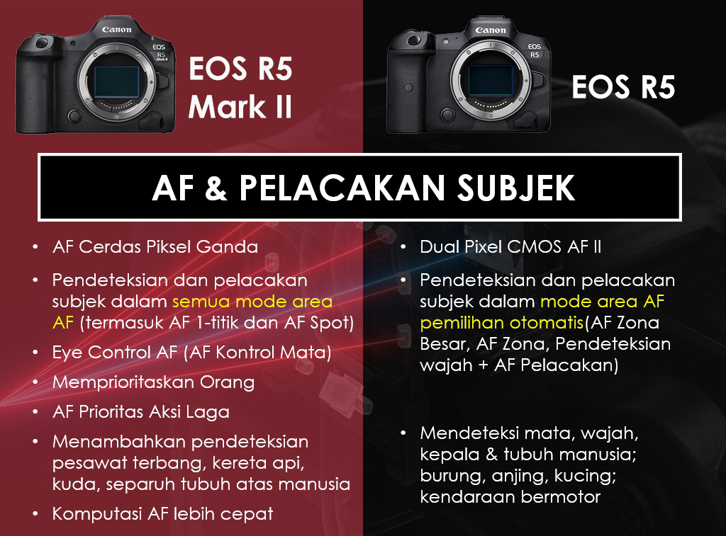 EOS R5 memiliki antarmuka pengoperasian AF yang lebih lama, di mana pendeteksian dan pelacakan subjek hanya dapat dilakukan dalam mode AF pemilihan otomatis (Face detection + tracking/ Large Zone/ Zone AF). Sementara itu, pada EOS R5 Mark II, pendeteksian dan pelacakan subjek tersedia dalam semua mode area AF, termasuk Spot AF dan 1-point AF, seperti pada EOS R3.