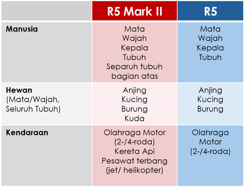 Seperti yang ditunjukkan tabel di atas, EOS R5 Mark II dapat mendeteksi subjek yang tidak dapat dilakukan oleh EOS R5.