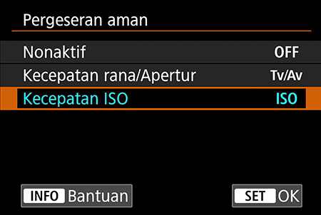 Saya menetapkan fungsi Safety Shift untuk menyesuaikan ISO Speed (kecepatan ISO).