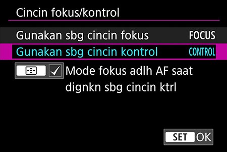 Cincin kontrol adalah knurled ring (cincin bergerigi) pada lensa RF/RF-S Anda. Cincin ini berfungsi seperti dial ekstra untuk menyesuaikan pengaturan yang sudah ditentukan.