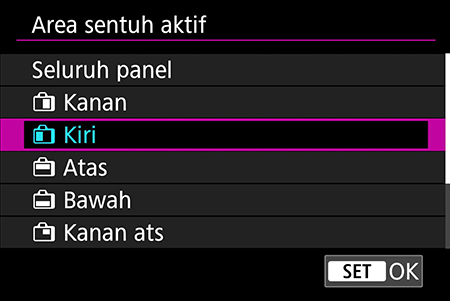 Menu ini mengatur bagian monitor belakang yang sensitif terhadap gerakan sentuh & tarik. Kami merekomendasikan untuk mengatur area sentuh aktif di sisi yang sama dengan mata jendela bidik dominan Anda—ini akan menjaga hidung Anda tidak menghalangi!