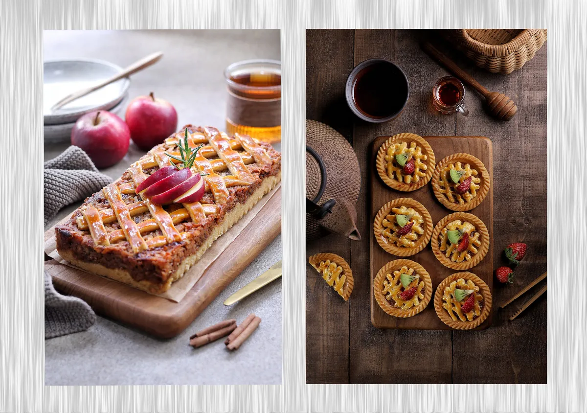 Untuk foto kue pai apel pada gambar pertama, saya menambahkan daun rosemary hijau sebagai aksen untuk kontras dengan warna cokelat dan merah pada pai apel. Daun rosemary melengkapi “cerita” menikmati camilan, karena dapat dicelupkan ke dalam teh untuk menambahkan cita rasa!