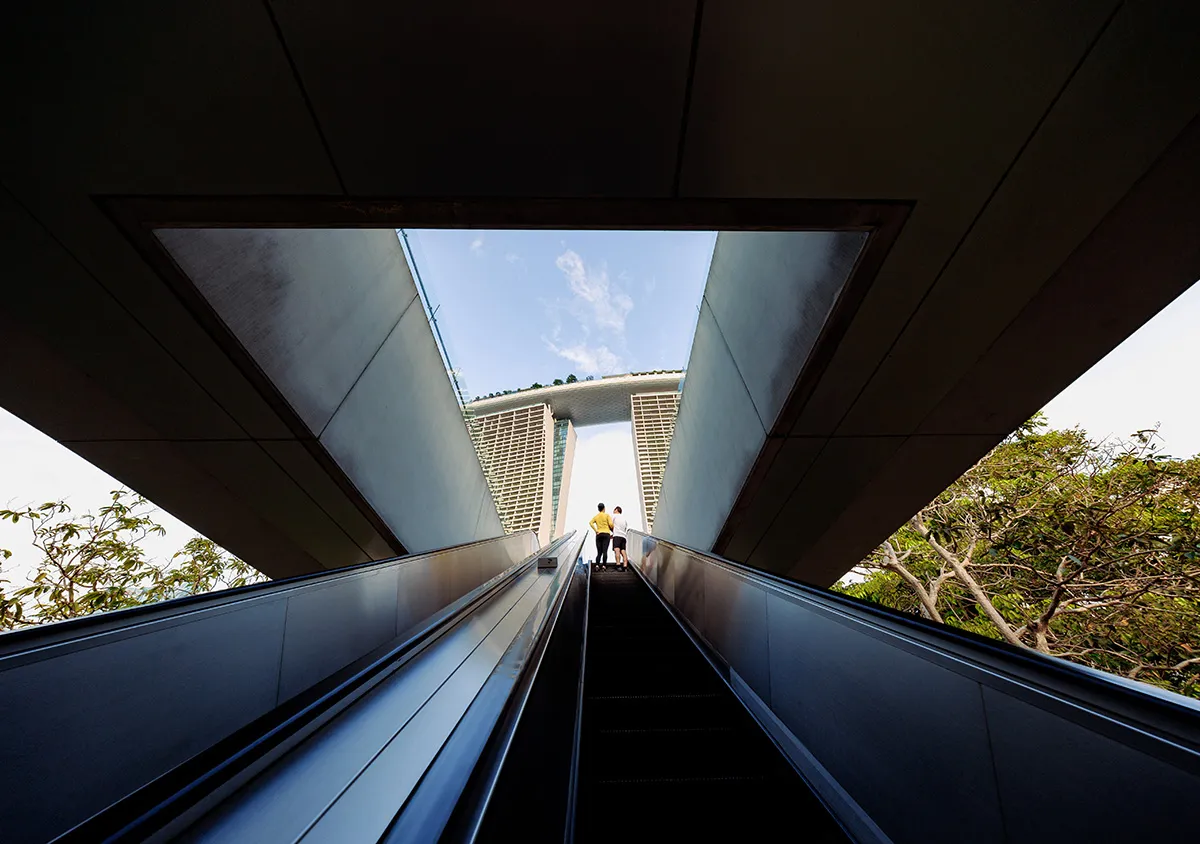 This is the same escalator in “2. Shooting distance”. See what happens when we shoot from a lower position and angle (tilting the camera upward). The glass panes and the triangle formed by the escalator look broader towards the base and more tapered towards the top in the low-angle shot, showing more obvious perspective.