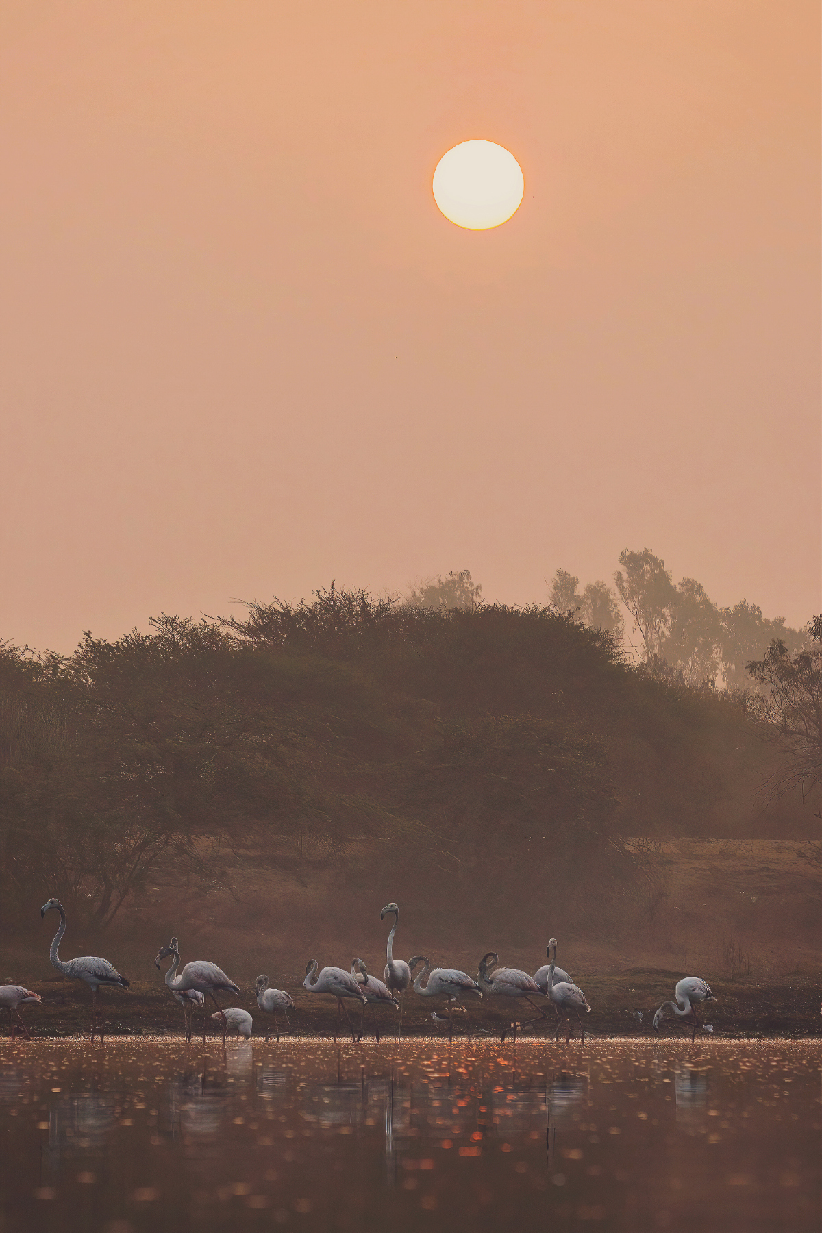 Beautiful greater flamingos enjoying the sunrise in winter morning.