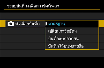 i) มาตรฐาน (ค่าเริ่มต้น): กล้องจะบันทึกภาพลงในการ์ดที่เลือกไว้ใน ‘บันทึก/ดูภาพ’ และการบันทึกจะหยุดลงเมื่อการ์ดเต็ม