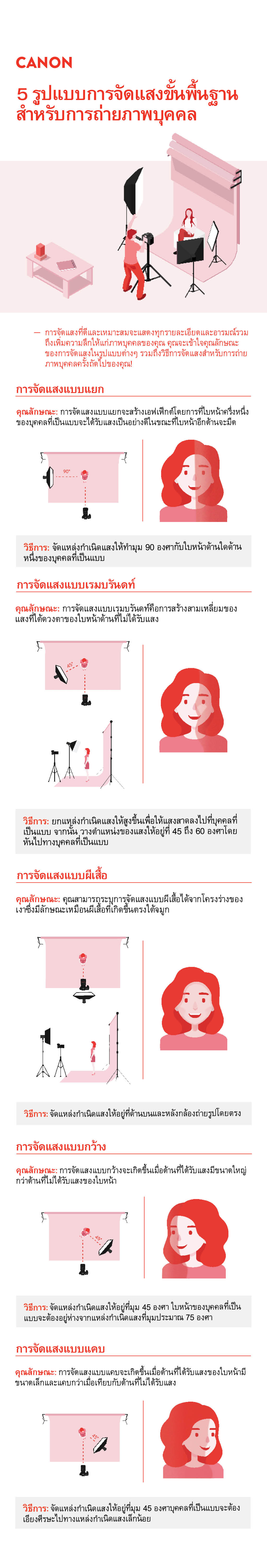 การจัดแสงที่ดีและเหมาะสมจะแสดงทุกรายละเอียดและอารมณ์รวมถึงเพิ่มความลึกให้แก่ภาพบุคคลของคุณ หากคุณเป็นมือใหม่ที่เพิ่งจะหัดถ่ายภาพบุคคลและกำลังมองหาทริกเด็ดๆ และเคล็ดลับดีๆ เพื่อให้ได้ภาพถ่ายที่ยอดเยี่ยม การรู้จักรูปแบบการจัดแสงง่ายๆ ทั้งห้านี้จะมีประโยชน์กับคุณมากดาวน์โหลดอินโฟกราฟิกแบบเข้าใจง่ายที่ด้านล่างและอ่านบทความเต็มซึ่งเราได้แชร์คุณลักษณะของการจัดแสงแต่ละรูปแบบ อารมณ์ที่ได้จากการจัดแสงและวิธีการจัดแสงขั้นพื้นฐาน