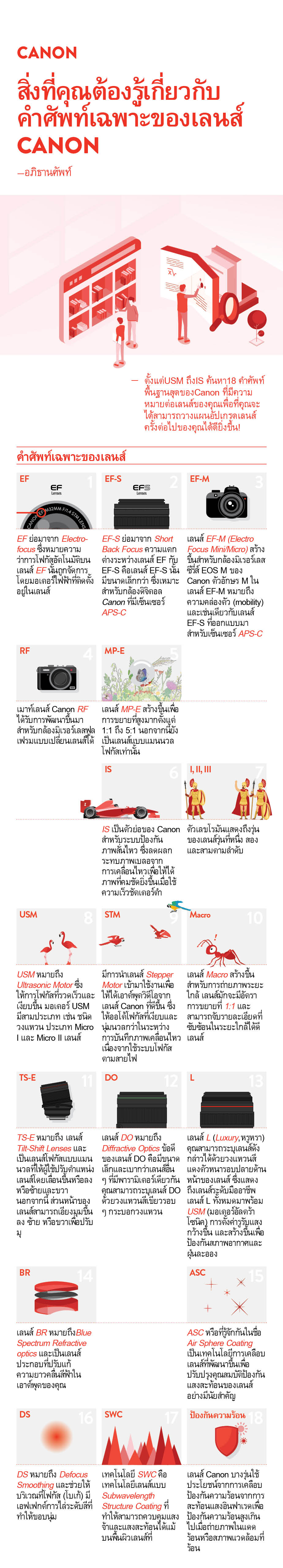 หากคุณค่อนข้างใหม่กับ Canon และพยายามที่จะปรับแต่งเลนส์ที่แตกต่างกันออกไป ตัวย่อเช่น IS, EF และ USM ที่ปรากฏอยู่บนผลิตภัณฑ์อาจทำให้คุณแปลกใจ เพื่อช่วยให้คุณหายงง เราได้รวบรวมคำศัพท์เกี่ยวกับเลนส์ Canon ที่พบมากที่สุด 18 คำไว้เป็นอินโฟกราฟิกที่มีประโยชน์ ดังนั้นคุณจะเข้าใจคำศัพท์เฉพาะมากขึ้นเมื่อคุณกำลังมองหาการอัปเกรดในครั้งต่อไป! ตรวจสอบด้านล่าง