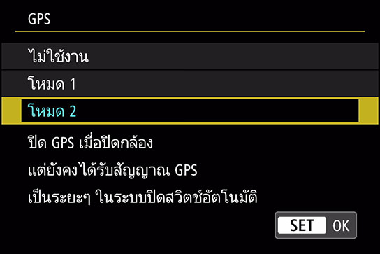 เมื่อตั้งค่ากล้องเป็น "โหมด 1" กล้องจะยังคงได้รับสัญญาณ GPS แม้ในภายหลังจากที่เลื่อนสวิตช์เปิดเปิดของกล้องไปที่ "ปิด" แล้วก็ตาม ซึ่งเป็นสาเหตุให้แบตเตอรี่หมดเร็วขึ้นแม้ว่าจะไม่ได้ใช้งานกล้องและอาจส่งผลให้แบตเตอรี่หมดในระหว่างการถ่ายภาพได้ ดังนั้น อย่าลืมว่าต้องตั้งค่ากล้องเป็น "โหมด 2" หากคุณต้องการใช้งานแบตเตอรี่กล้องได้ยาวนานขึ้น