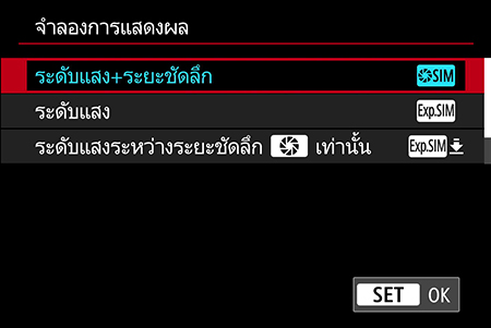 เลือก “Exposure+DOF” จากนั้นกดปุ่ม SET กล้องของคุณจะแสดงทั้งตัวอย่างของความสว่างจริงและระยะชัดตามการตั้งค่าการเปิดรับแสงของคุณ