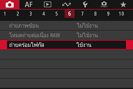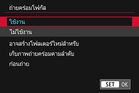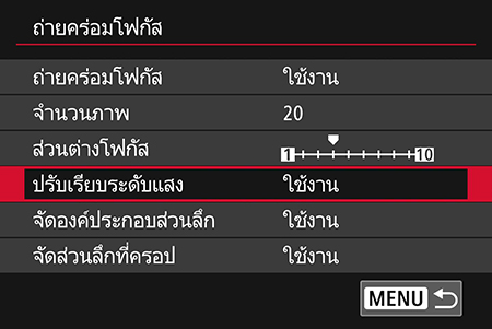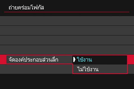 ฟังก์ชั่นนี้จะปิดการใช้งานโดยค่าเริ่มต้น การเปิดใช้งานจะเป็นการสั่งให้กล้องนำภาพจากการ Focus Bracketing มารวมกันโดยอัตโนมัติหลังถ่ายภาพ