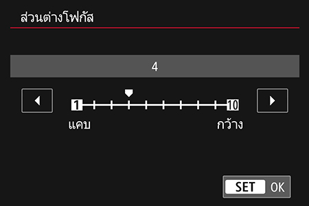 การตั้งค่านี้เป็นตัวกำหนดว่าโฟกัสจะเปลี่ยนแปลงไปมากเท่าใดในแต่ละภาพ กล้องจะปรับตำแหน่งโฟกัสโดยอัตโนมัติเพื่อให้เหมาะกับค่ารูรับแสง ระยะชัดที่นำมารวมกันจะมีค่าสูงสุดเมื่อใช้ค่ารูรับแสงแคบ (ค่า f สูง) นอกจากนี้ ทางยาวโฟกัสและเลนส์ก็อาจส่งผลต่อภาพที่ได้เช่นกัน
