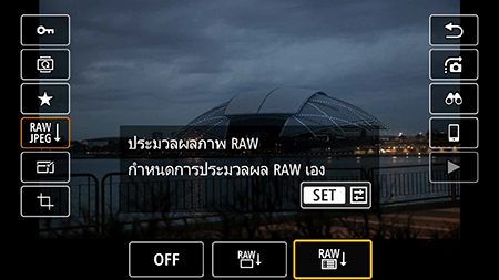 1. ในโหมดดูภาพ ให้กดปุ่ม SET แล้วไปที่ไอคอนประมวลผลภาพ RAW เลือกไอคอนขวาสุดเพื่อปรับแต่งการประมวลผล RAW