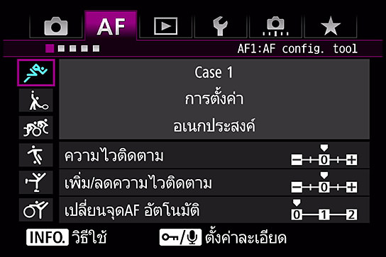 ในส่วนของเลนส์ ผมเลือกใช้ EF70-200mm f/2.8L IS II USM ซึ่งเป็นเลนส์ที่ช่างภาพมืออาชีพนิยมใช้กันทั่วไป และปรับค่าความไวแสง ISO เพื่อให้ความเร็วชัตเตอร์และรูรับแสงอยู่ที่ 1/1,000 วินาทีและ f/2.8 ตามลำดับ หลังจากระบบ AF จับโฟกัสไปที่นักแข่ง ผมกดปุ่มชัตเตอร์ค้างไว้ จากนั้นจึงขยับกล้องเพื่อให้ตัวแบบเข้ามาอยู่ในบริเวณ AF ที่เลือกไว้เพื่อถ่ายภาพต่อเนื่อง จนกระทั่งผู้เข้าแข่งขันเข้ามาใกล้และเคลื่อนที่ออกจากองค์ประกอบภาพ สำหรับเครื่องมือการปรับแต่ง AF ซึ่งใช้สำหรับปรับคุณสมบัติต่างๆ ของ AI Servo AF นั้น ผมได้ตั้งค่าเป็นการตั้งค่ามาตรฐาน - Case 1