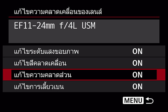 เมนูนี้เป็นเมนูที่ใช้สำหรับแก้ไขผลกระทบต่างๆ ที่เกิดจากลักษณะเฉพาะด้านออพติคอลของเลนส์ ค่าเริ่มต้นสำหรับการแก้ไขแสงสว่างที่ขอบภาพ การแก้ไขความคลาดสี และการแก้ไขการกระจายแสงจะตั้งค่าไว้ที่ [ใช้งาน] ในขณะที่ค่าเริ่มต้นสำหรับการแก้ไขความบิดเบี้ยวจะตั้งค่าไว้ที่ [ไม่ใช้งาน]