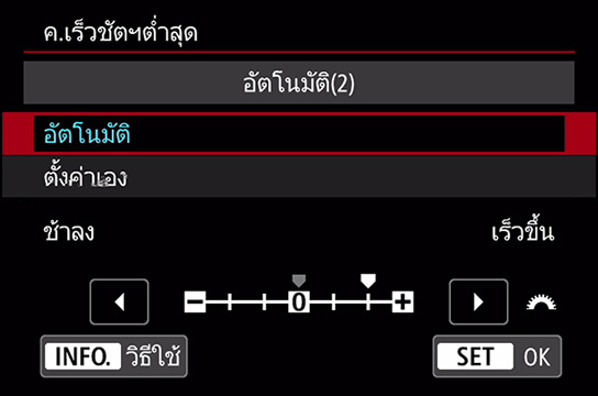 แม้ว่าปัญหากล้องสั่นสามารถชดเชยด้วยระบบป้องกันภาพสั่นไหวได้ แต่จำเป็นต้องใช้ความเร็วชัตเตอร์สูงเพื่อลดการสั่นไหวของตัวแบบด้วย เมื่อใช้โหมด Program AE หรือโหมดระบุค่ารูรับแสง ให้เลือก [อัตโนมัติ] จากเมนู [ความเร็วชัตเตอร์ต่ำสุด] ภายใต้ [การตั้งค่าความไวแสง ISO] และตั้งค่าความเร็วเป็น "เร็วขึ้น" เพื่อเปลี่ยนบรรทัดของโปรแกรมและลดการสั่นไหวของตัวแบบได้ดียิ่งขึ้น