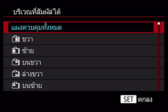 ในเมนูการตั้งค่า "Touch & Drag AF" จะมีรายการ "พื้นที่สัมผัสที่ใช้งาน" ที่คุณสามารถระบุได้ว่าจะใช้ส่วนใดบนหน้าจอ LCD ด้านหลังสำหรับ Touch & Drag AF
