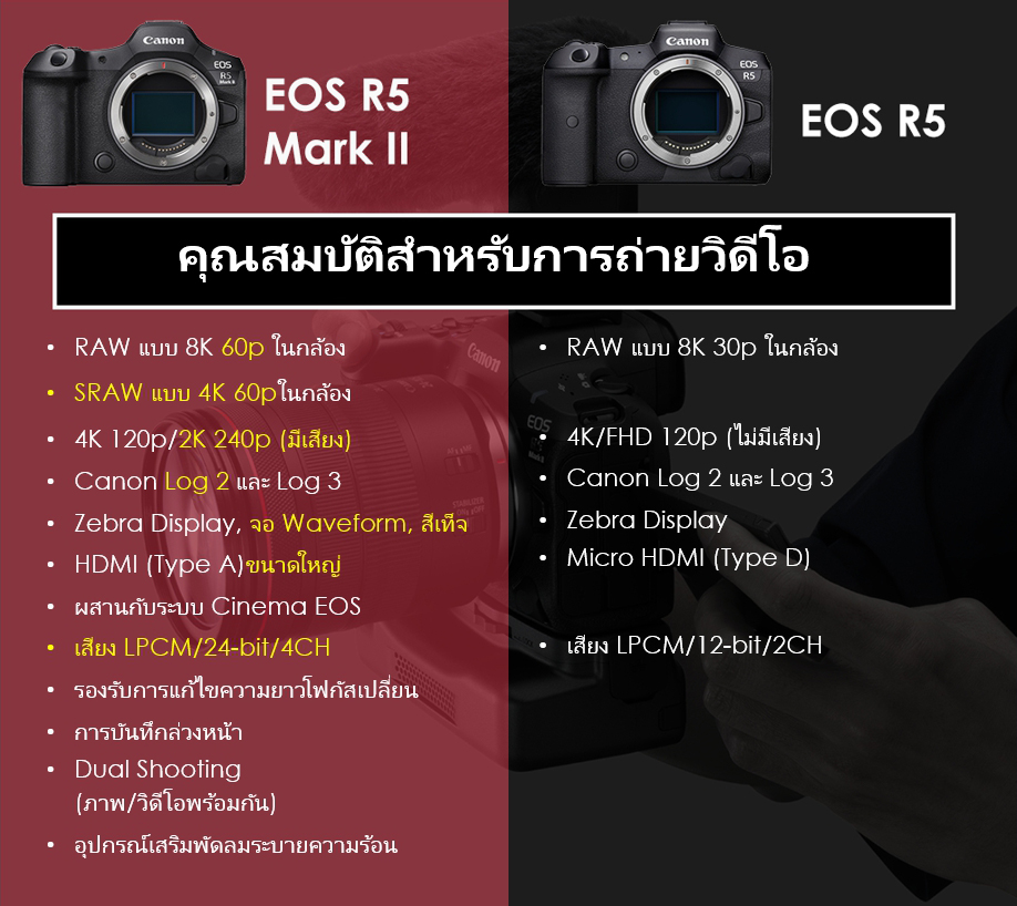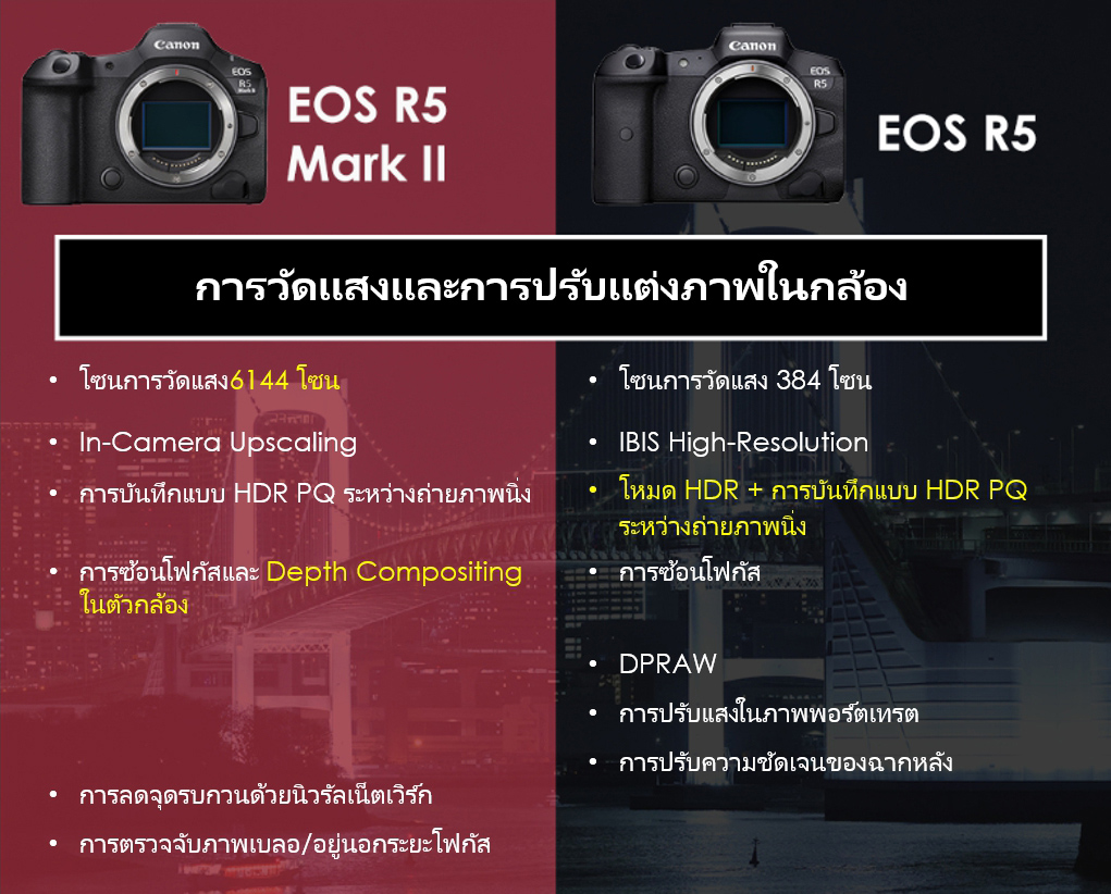 รายละเอียดเกี่ยวกับการพัฒนาและคุณสมบัติใหม่เหล่านี้จะอยู่ในอีกบทความหนึ่งแยกกัน เราได้อธิบายรายละเอียดบางส่วนไว้แล้วใน 7 คุณสมบัติของกล้อง EOS R5 Mark II ที่พลิกโฉมวงการถ่ายภาพ และต่อไปนี้คือสรุปข้อแตกต่างบางส่วนที่คุณอาจมองไม่เห็นในทันทีจากข้อมูลจำเพาะด้านบน