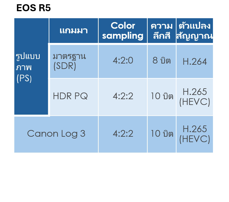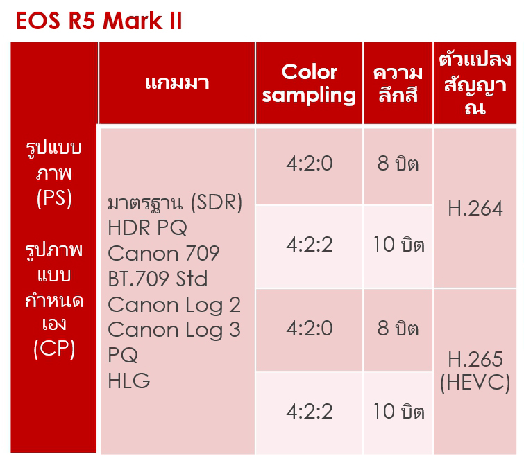 นอกจากมีตัวเลือกแกมมาและ LUT/โปรไฟล์สีมากกว่า EOS R5 แล้ว EOS R5 Mark II ยังให้ผู้ใช้สามารถตั้งค่าตัวแปลงสัญญาณการบันทึกและความลึกสี/Colour sampling ได้อย่างยืดหยุ่นมากขึ้น ตอนนี้ผู้ใช้สามารถเลือกบันทึกภาพแบบ HDR และวิดีโอ Canon Log 2/3 ได้ในรูปแบบ H.264 ซึ่งสามารถใช้งานร่วมกันได้มากกว่า มีความต้องการในการประมวลผลที่ต่ำกว่า และเหมาะอย่างยิ่งสำหรับการสตรีมทางออนไลน์ นอกจากนี้ยังสามารถบันทึกวิดีโอแบบ SDR (มาตรฐาน) ได้อย่างมีประสิทธิภาพมากขึ้นในรูปแบบของตัวแปลงสัญญาณที่บีบอัดแบบ H.265 ซึ่งใช้อัลกอริทึมการบีบอัดขั้นสูง เพื่อให้คุณภาพของวิดีโอที่ดียิ่งขึ้นด้วยอัตราบิตที่เท่ากันกับ H.264
