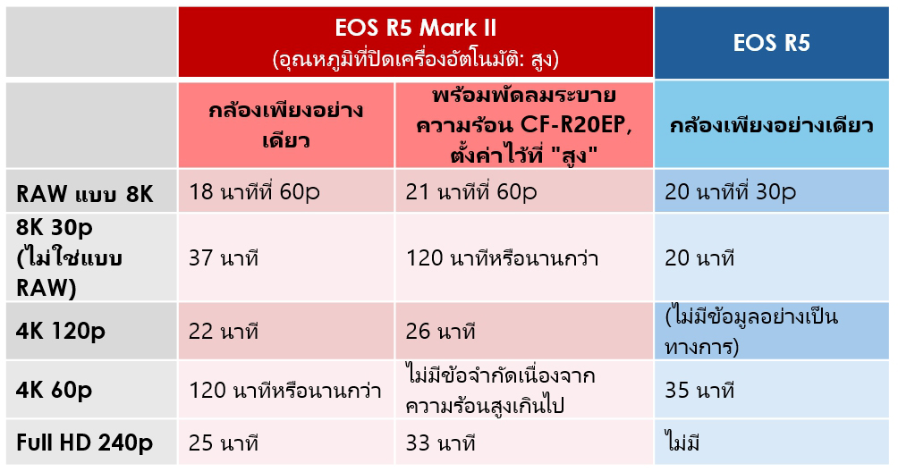 ตารางต่อไปนี้จะเปรียบเทียบเวลาการบันทึกสูงสุดของกล้องที่อุณหภูมิ 23°C เมื่อเปิดกล้อง