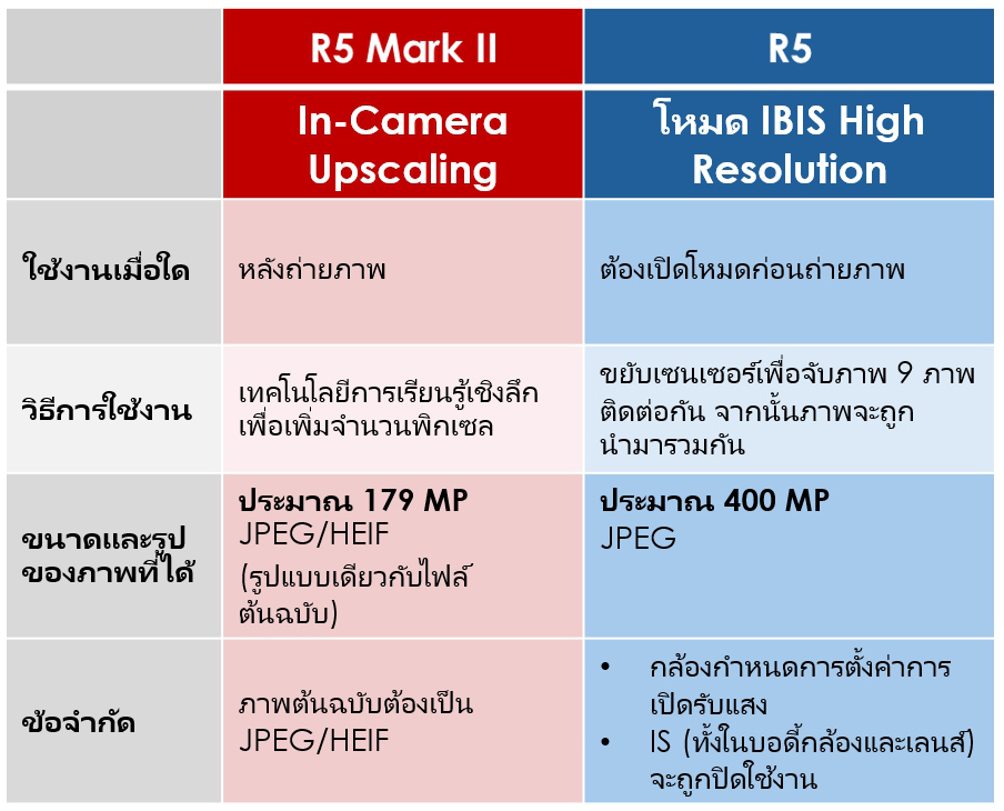 กล้องทั้งสองรุ่นมีคุณสมบัติที่ช่วยเพิ่มความละเอียดของภาพ ได้แก่ โหมด IBIS High Resolution ใน EOS R5 ซึ่งเพิ่มเข้ามาในการอัปเดตเฟิร์มแวร์ และ In-camera Upscaling ใน EOS R5 Mark II โดยคุณสมบัติทั้งสองนี้จะทำงานในลักษณะที่แตกต่างกัน ดังที่สรุปไว้ต่อไปนี้