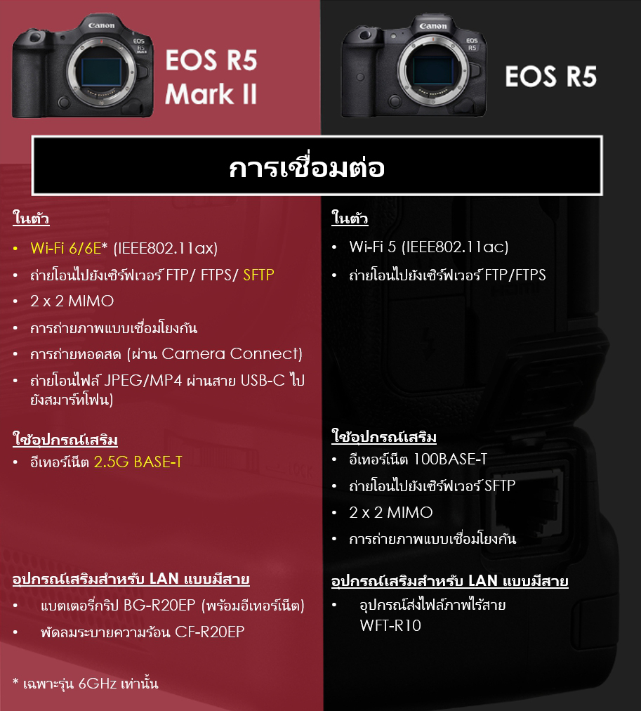 ขณะเดียวกัน EOS R5 ต้องใช้อุปกรณ์ส่งไฟล์ภาพไร้สาย WFT-R10 สำหรับการเชื่อมต่อ LAN แบบมีสาย