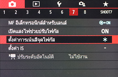 สำหรับกล้องที่ไม่มีแท็บเมนู AF คุณจะพบฟังก์ชั่น MF Peaking ในเมนู SHOOT และสำหรับกล้อง EOS M50 จะอยู่ในเมนู SHOOT 7