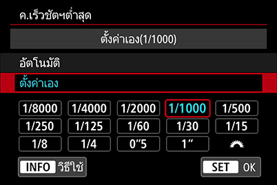 4. เลือก “ตั้งค่าเอง” และเลือกความเร็วชัตเตอร์ต่ำสุดที่คุณต้องการสำหรับตัวแบบ*