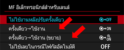 สำหรับการใช้งานแมนนวลโฟกัสแบบ Full-time คุณจำเป็นจะต้องเปลี่ยนการตั้งค่ากล้องและเปิดใช้งานหนึ่งในสองตัวเลือกตามที่ลูกศรชี้ โปรดดูรายละเอียดเพิ่มเติมในคู่มือการใช้งานกล้องของคุณ สำหรับเลนส์ส่วนใหญ่ แมนนวลโฟกัสแบบ Full-time จะรองรับในโหมด One-Shot AF เท่านั้น อย่างไรก็ตาม เลนส์บางรุ่น เช่น RF400mm f/2.8L IS USM และ RF600mm f/4L IS USM ยังรองรับในโหมด Servo AF อีกด้วย