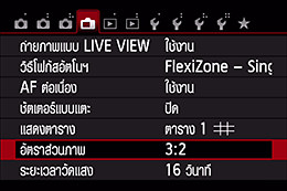 กดปุ่ม MENU ที่บอดี้กล้องด้านหลังเพื่อเข้าสู่รายการ “อัตราส่วนภาพ” ในเมนู Live View ระหว่างการถ่ายภาพ Live View ภาพจะแสดงบนจอ LCD ในอัตราส่วนภาพที่เลือก